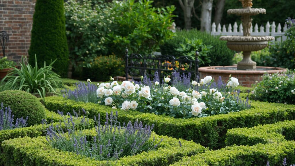 These plants enhance roses without overpowering them, creating a layered but controlled visual effect.