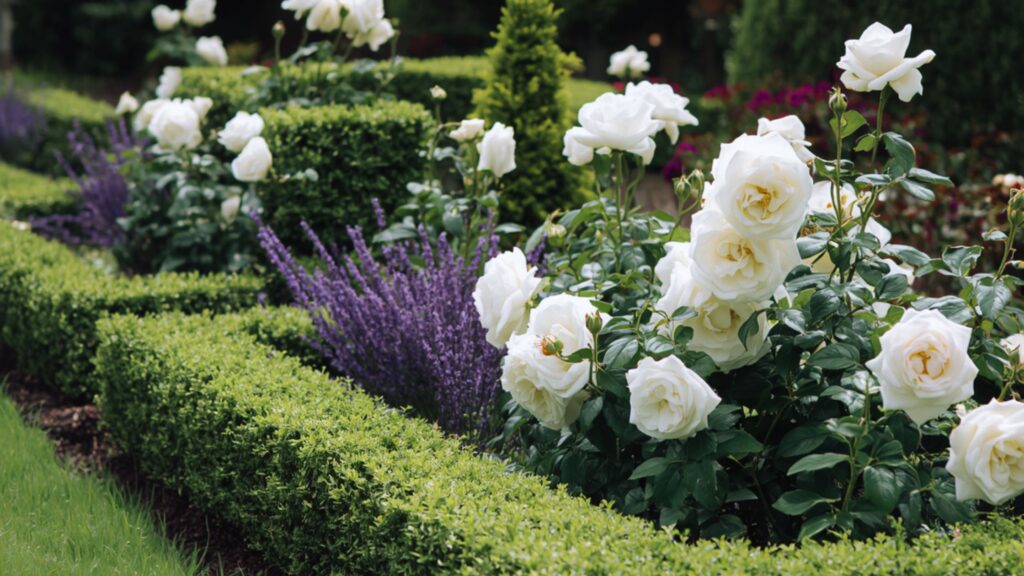 White roses are particularly powerful in design because they create a structured, architectural effect when planted in repetition.