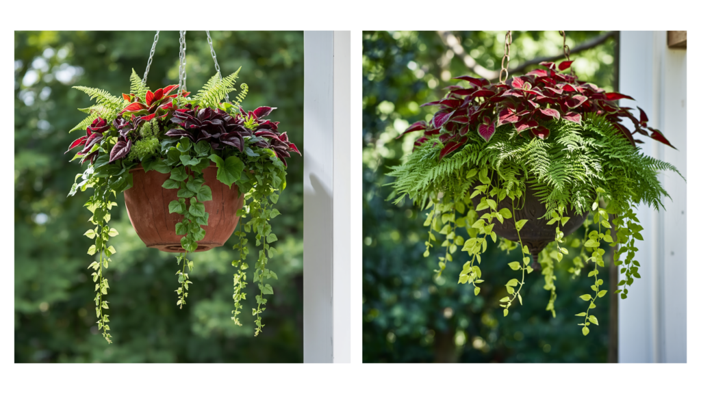 You can also incorporate hanging baskets to bring height and movement into shaded areas, creating a more layered, intentional look.